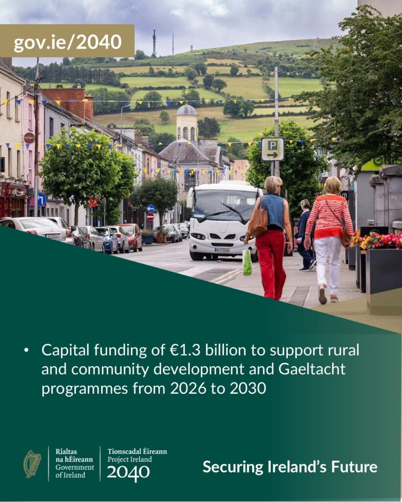 - Capital funding of €1.3 billion to support rural and community development and Gaeltacht programmes from 2026 to 2030